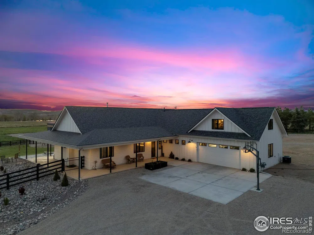 Welcome to Colorado living at its finest. This beautiful 4bed 4 bath gated 10+ acre property sits at the end of a paved cul-de-sac, surrounded by mature trees, evergreens, and unobstructed views of the foothills. Backing to 217 acres of protected farm easement, it offers unmatched privacy and serenity. Built in 2021, the custom ranch-style home features vaulted ceilings, polished stamped concrete floors, stainless steel appliances, and a wraparound porch. The open layout separates bedrooms for added privacy and offers low maintenance, modern living.The 80' x 32' metal pole barn includes concrete floors, 220V power, its own septic system, and separate 200-amp electric service. Inside is a woodworking shop, extra storage, and RV hookups, with plumbing ready for a future bathroom. HOA provides irrigation water keeps lawns and gardens green year-round an ideal setup for peaceful, private living with space to spread out.