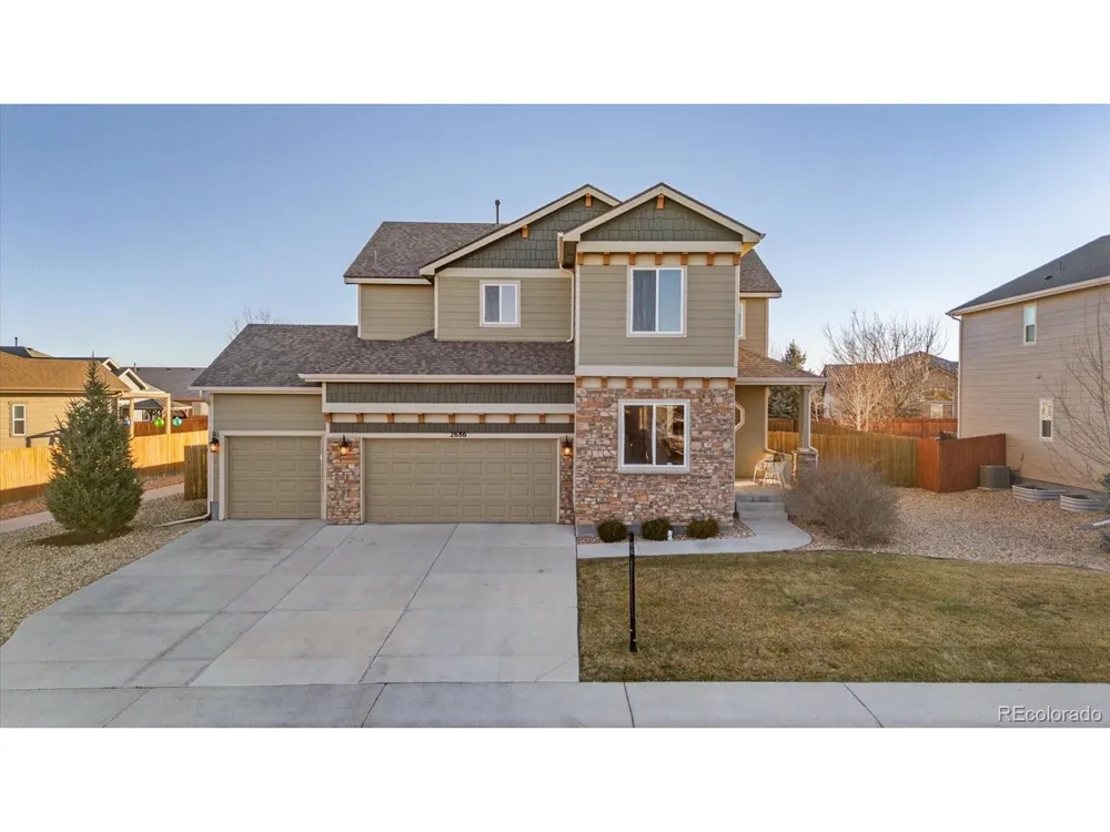 Incredibly beautiful home in Liberty Ranch with 4-car garage, park access across street and huge primary retreat! Brand new FURNACE! Roof is only 2 years old! This is not your typical builder grade home! Beautiful dormers, full rugged stone elevation, shaker siding, bump outs and corbels create stunning curb appeal! Large covered front porch greets you with 2-story entry along with stunning hewn style wood floors. Study on the main is a great work from home option with powder bath around the corner. Granite countertops, stainless appliances, pantry, tons of counter space and bar seating make this kitchen perfect for gourmet cooking and fun family gatherings. Extra lighting package to keep it light and bright! Large dining room area with more natural light and views to the backyard make entertaining a breeze! Huge custom patio in backyard is a perfect for summer BBQ's or relaxing family and friends time. Beautiful staircase with upgraded railing is a stunning first impression! Four large bedrooms upstairs keep everyone together, and small loft area for reading nook or business station is also a plus including a large full secondary bath with dual sinks and upgraded tile package. Upstairs Laundry! The primary bedroom, though!!! This is a huge retreat for sure! Seating area, dual sided fireplace and large primary bath with soaker tub allow for quiet peaceful evenings in your own space. Dual sinks, upgraded tile package in walk-in shower and large walk-in closet add to this amazing retreat! Garage is HUGE with an extra large built in storage shelf over tandem bay. Don't forget a full unfinished basement for storage or ready for expansion with rough in already in place! sidewalk to park with tennis and basketball court, playground, ballfield and new bathrooms coming! This home is a great location only a couple minutes to I-25!